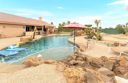 Esta casa de vacaciones en Bermuda Dunes está situada en un gran terreno de 1/2 acre, amurallado para su privacidad, con una gran piscina con cascada de rocas y spa. Disfrutará de las hermosas vistas a la montaña mientras descansa junto a la espectacular piscina en este tranquilo oasis en el patio trasero.