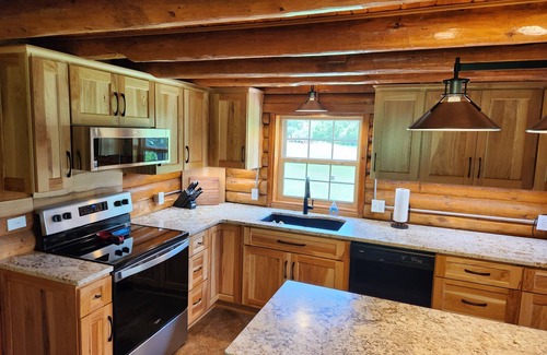 El albergue cuenta con dos grandes porches cubiertos con un montón de asientos al aire libre para que pueda disfrutar de una taza de café en la mañana y la vida silvestre en la oscuridad. Un asador de gas y cocina totalmente amueblada hace comer una brisa. Televisores de pantalla plana y muebles de cuero para hacer una casa de campo como la sensación.