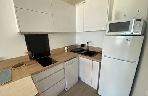Estudio a pie de playa, gran nevera, lavavajillas, lavadora, parking privado Se encuentra en Marseillan Plage. Estudio a pie de playa, gran nevera, lavavajillas, lavadora, parking privado ofrece alojamiento, con TV, Frente al mar, Cocina, Entre otras comodidades. Estas características Apartamento TV, Frente al mar, Cocina, Para que su estadía sea cómoda.