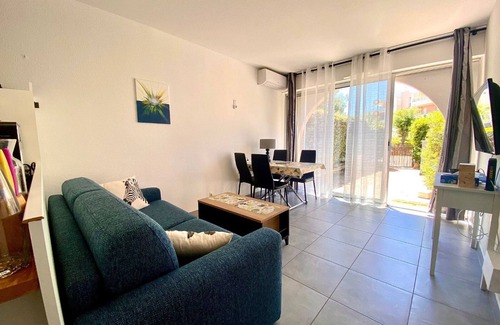 Apartamento estudio orientado al sur en la planta baja de un edificio situado a tan solo 100 metros de la laguna de Thau y de la playa. Incluye una zona de cocina (equipada con frigorífico, lavavajillas y microondas), zona de comedor, baño con lavadora, zona de estar con TV y sofá cama (para 1 persona) y zona de dormitorio con cama doble. El estudio da a un pequeño jardín pavimentado con barbacoa y mobiliario de exterior (incluidas tumbonas). Acceso directo a las playas de Meze y plaza de aparcamiento privado cerca del apartamento.