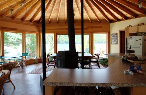 Diseño: un nivel para facilitar el acceso y la vida al aire libre: espacio abierto de techo de catedral con cocina totalmente equipada; Área de comedor con estufa de leña y sala de estar con hermosas vistas al lago; dormitorio principal del ala derecha con vistas al agua, cama King nueva, unidad de calefacción y acceso a la cubierta junto al agua; baño completo con lavandería y ducha, segundo dormitorio del ala izquierda con dos nuevas camas Queen y vistas al lago, tercer dormitorio del ala izquierda con litera, Queen en la parte inferior y vistas gemelas en la cima y al lago; Baño completo compartido con ducha, fantástica terraza junto al agua amueblada con vistas al lago y a la montaña, muelle y playa de arena con hermosas vistas al lago y a la montaña.