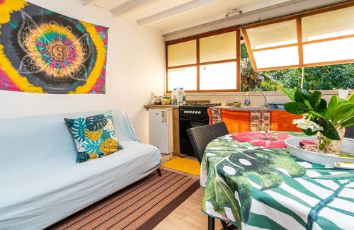 Lost in the heart of nature, this charming bungalow embodies the authenticity of Polynesian life. Set in lush vegetation, this little haven of peace, far from 5-star hotels, is the perfect balance between comfort and traditional rusticity. The songs of tropical birds will wake you in the morning and the gentle murmur of the nearby river will lull you to sleep in the evening.