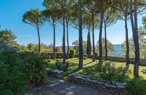 La finca en la que se encuentra la casa tiene una superficie de aproximadamente 40 hectáreas, la mayoría de los cuales están cubiertos por bosques y, por una hectárea y media, por un olivar. El parque está completamente cercada por alrededor de 1 hectárea; aquí se alternan con césped caminos y áreas pavimentadas, flanqueados por todas partes bordes de colores, plantas medicinales, árboles altos y árboles frutales. El área de la aldea que pertenece a la casa tiene acceso independiente y directo desde el aparcamiento en la parte trasera de la casa, al final de la calzada interior, la adelfa forrado y está bordeado por un lado por un bosque de pinos de configurar como zona de juegos para los niños y por el otro por un gran jardín bien cuidado. En esta zona verde rodeada de olivos, en frente de la puerta-ventana en la entrada y la cocina y protegido por la fresca sombra de un nogal majestuosa, un comedor al aire libre / sala de estar se ha establecido, rodeado de hortensias, hibisco y fragante jazmín, el lugar ideal para comer o simplemente para relajarse.