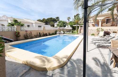 Elegante chalet con piscina privada en Jávea, a 6 km de la playa del Arenal y con mucho espacio para 6 huéspedes.