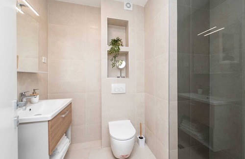 El amplio apartamento Villa Fresca A2 de 50 m2 está ubicado en el primer piso y ofrece alojamiento para 4 personas en 2 habitaciones de estilo moderno, una con una cama doble y la otra con una cama individual. El baño está equipado con ducha y posee todos los elementos necesarios como toallas y secador de pelo. La cocina moderna está equipada con todos los electrodomésticos y utensilios de cocina y está conectada al comedor, que tiene vista al impresionante mar Adriático. El área de la sala de estar está decorada en tonos crema neutros, creando un ambiente acogedor perfecto para relajarse. Los huéspedes encontrarán que la sala de estar está equipada con un sofá cama, que puede actuar como un espacio para dormir para una persona. Las enormes puertas corredizas de la sala de estar conducen a un balcón con muebles de jardín, donde se puede disfrutar de una buena taza de café mientras se disfruta de una hermosa vista de la playa. No olvide que Villa Fresca admite mascotas, lo que significa que los miembros peludos de la familia también pueden unirse a las vacaciones. Una mascota es posible con previa solicitud y pago adicional. Los apartamentos Fresca F1, F2 y F3 comparten una lavadora ubicada en la sala común. La zona exterior ocupa 700m2 de terreno y ofrece a sus huéspedes una área de barbacoa, donde los huéspedes pueden mostrar sus habilidades culinarias en acción. Para los huéspedes que lleguen en coche, Villa Fresca ofrece una plaza de aparcamiento en la propiedad. Villa Fresca es una hermosa villa frente al mar con una vista panorámica del mar Adriático ubicada en un pequeño pueblo de Dalmacia llamado Bibinje. Además de la vista absolutamente impresionante, Villa Fresca tiene una historia fascinante. Fue construido sobre un hallazgo arqueológico de una villa romana, que se cree data del siglo I. Los restos de la villa se pueden ver aún hoy en el mar frente a Villa Fresca, mientras que un mosaico de la villa romana se exhibe en la planta baja de Villa Fresca. La posición de Villa Fresca en la costa del Adriático hace de la villa una opción ideal para unas vacaciones verdaderamente lujosas y relajantes en Croacia.