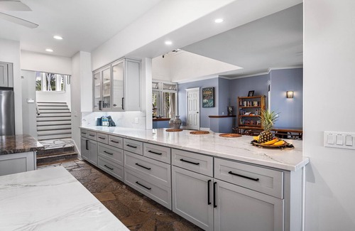 A la derecha de la sala de estar, encontrará la espaciosa cocina, que está amueblada con un área para comer y todos los elementos esenciales para cocinar que pueda imaginar. Con vistas al océano, mucho espacio y muchos asientos, se sentirá inspirado para preparar un excelente desayuno, mezclar un batido tropical o saborear una taza de café Kona para usted y sus invitados.