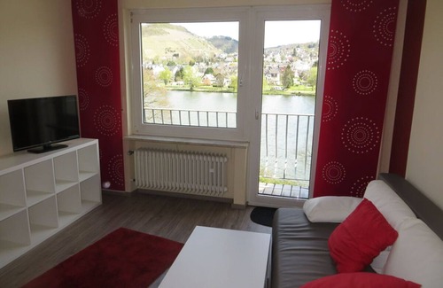 Holiday apartment No. 2 is approx. 55m² in size. It is located on the 2nd floor, directly on the Moselle and can accommodate up to 2 people. The apartment consists of a living room with a sofa, satellite TV and direct access to a balcony with a direct view of the Moselle, a separate kitchen and a bedroom with a bathroom with shower and toilet. The kitchen is equipped with a 4-plate stove, oven, dishwasher, refrigerator, sink, kettle, vacuum cleaner, toaster and coffee machine. Free Wi-Fi access is available in the house, smoking is only permitted on the balcony.