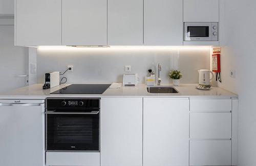 It comes with an open floor plan. The living space features a comfortable sofa, TV and a dining table. The kitchenette is fully equipped with essential cookware and cutleries you'll need to cook delicious meals, such as an electric hob, an oven and a coffee machine. A washing machine is also available if you wish to do the laundry. The room has oversized windows that let in a lot of natural sunlight that brightens up the space, making it even more inviting, and it offers access to a balcony to enjoy the views.