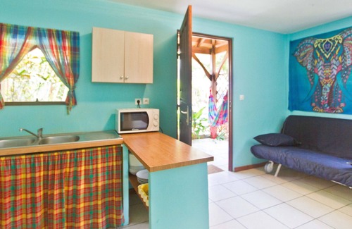 En una pequeña estructura de madera en medio de un hermoso jardín tropical con piscina, bungalow independiente con una terraza cubierta (muebles de jardín, hamaca, barbacoa, secadora), habitaciones con aire acondicionado, una sala de estar con sofá cama , TV, radio, WIFI, cocina amueblada, ducha-lavabo-inodoro.