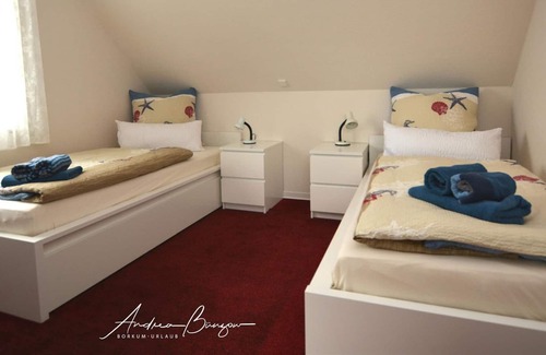 Esta habitación cuenta con 2 camas individuales, suelo de moqueta y TV vía satélite. El alquiler es para una persona en habitación doble 35- €. Para una ocupación de 2 personas pagas solo 45.- € / noche. Calefacción por suelo radiante en todas las habitaciones. En cada una de las dos plantas hay un baño compartido con ducha y aseo. En la planta baja se encuentra la sala de estar como sala común con TV, reproductor de DVD y equipo de música. Una colección de DVD, una pequeña biblioteca y una selección de juegos te ayudarán a relajarte. La cocina está ahí para que usted se cuide y el desayuno se sirve aquí. En la planta superior hay otra cocina. La ropa de cama y las toallas están incluidas en el precio. El desayuno es opcional zubuchbar para 8 personas por persona. ¿Puedo escuchar una pregunta sobre WiFi? - Eso está en preparación y pedido. Lamentablemente algunas cosas tardan un poco más ... La lavadora y la secadora están ubicadas en el cuarto de servicio y se pueden usar conjuntamente por una tarifa.