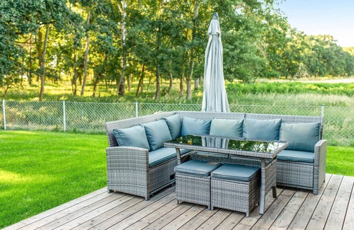 Esta moderna y elegante casa de vacaciones le da la bienvenida a orillas de la laguna de Szczecin.