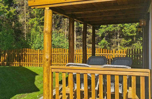 Relájese en esta encantadora casa de vacaciones con un ambiente acogedor y terraza cubierta.
