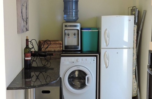 El área de servicios públicos tiene una lavadora, una plancha y tabla de planchar, una nevera con congelador y un dispensador de agua. También hay calefacción de gas para las acogedoras tardes de otoño y primavera.