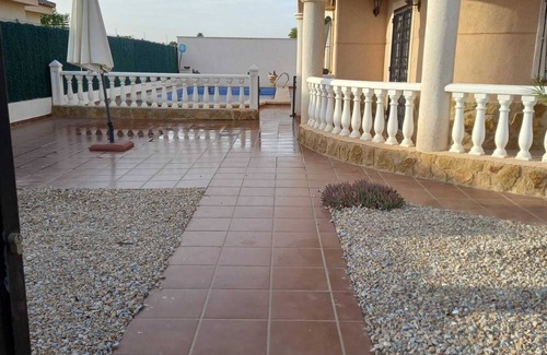 Esta hermosa villa independiente está situada en el borde de la reserva natural de El Valle y Carrascoy en Murcia. La distancia a las hermosas playas de arena del Mar Menor es de 20 km y se puede llegar por la autopista en 20 minutos. A pocos kilómetros se encuentran varios campos de golf de 18 hoyos. La villa está ubicada en un barrio residencial donde también puedes encontrar un bar-restaurante. En pocos minutos en coche puede llegar al típico pueblo español de Balsicas, donde puede tomar el tren a Cartagena, Elche, Alicante y Madrid. La villa ha sido construida recientemente y es muy espaciosa y práctica. Todo está en un piso y la parcela es completamente plana, por lo tanto, es adecuada para el uso de sillas de ruedas. La casa cuenta con un amplio hall, un amplio salón con chimenea, una cocina de 20 m2 equipada con todas las comodidades, 3 dormitorios y 2 baños. Un baño es en suite con ducha y el otro baño tiene una gran bañera de esquina. El salón se abre a una gran terraza donde se encuentra la piscina de 4x8 metros. La piscina tiene escalones romanos en un extremo y una escalera de metal en el lado profundo. La trama está completamente amurallada. La villa dispone de aire acondicionado con calefacción, lavadora, lavavajillas, alarma, barbacoa y aparcamiento. La villa está equipada para 6 personas.