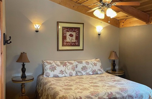 King suite incluye baño de tamaño completo y altillo lectura de descanso, y la reina hospedería también tiene un baño completo contiguo, todos tienen sábanas y toallas de algodón de alta conteo, cocina de acero inoxidable totalmente equipada, e incluso el agua se filtra. Ofrecemos TV de pantalla plana sobre la chimenea de gas elegante, reproductor de DVD / CD, bañera de hidromasaje con gas, en una hermosa envoltura alrededor de la cubierta con mesa de paraguas / sillas con cojines, parrilla eléctrica, pozo de fuego cercano, todas las carreteras y camino de acceso pavimentado a su puerta principal. Este chalet es definitivamente su hogar lejos de casa!