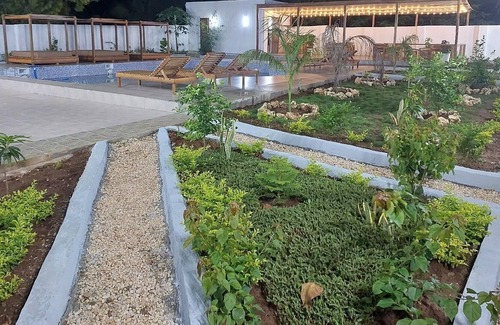 Nice garden there is around villa with flowers, fruit trees. Also there is big swimming pool with sunbath area and beds