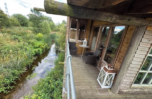 Large cozy cabin in Weston with permanent hot tub & superking bed. (Could accommodate 4 with notice) This adorable retreat cantilevered over the beck offers kitchen & shower room, heating by log burning stove, hair dryer, heating, and an iron/board for your convenience. Relax in the comfortable living room with Free WiFi and 65” Samsung smart TV open plan bedroom and enjoy the peaceful surroundings. We're happy to assist with any questions while you stay at our cabin.