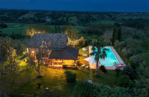 ESTRUCTURA PRIVADA. Un pintoresco bosque de nogales es el escenario de esta casa de campo rústico, situado a pocos kilómetros del centro de Marta, un atractivo pueblo pesquero de origen etrusco, a orillas del Lago de Bolsena. El núcleo central del edificio, que data de 1600, se ha ampliado gradualmente a lo largo de los años y la última actualización, realizada por los actuales propietarios, ha producido su configuración actual: una casa de dos pisos revestido en piedra con un grande, luminoso salón zona, que se extiende fuera al pórtico amueblado, y cuatro grandes dormitorios. Piedra travertino, ladrillos de terracota y grandes vigas de madera son los materiales que caracterizan el interior, animada por los tonos brillantes y enérgicos de rojo y ocre de las paredes y por habitaciones cuidadosamente decoradas, personalizadas con decoraciones florales, mobiliario tradicional y accesorios étnicos: un éxito crisol de estilos e inspiraciones que confiere estilo y personalidad en esta acogedora casa que fuera, se completa con un jardín exuberante cuidados cercado con amplias zonas de césped, ideal para familias con niños, con una gran variedad de plantas y una hermosa , gran piscina situada justo en frente del pórtico. Il Noceto es una gran opción para aquellos que deseen relajarse en la tranquilidad del campo o para pasear por el llamado 'Paseo', el hermoso lago rodeado de árboles de Bolsena, bordeada por pequeñas playas ubicadas a las afueras de la ciudad y que se caracterizan por encantadores pequeños restaurantes que ofrecen platos típicos a base de pescado, desde donde se pueden admirar las islas de Martana y Bisentina. Estamos en el centro de la Tuscia Viterbese, epicentro entre la Toscana, Umbria y Lazio, una tierra rica en recursos naturales y culturales, el destino ideal para aquellos en busca de menos frecuentada, pero igualmente fascinantes y sorprendentes, rutas a los centros históricos de prestigio como Viterbo, Tuscania, Montefiascone, Bomarzo, Civita di Bagnoregio y, yendo más lejos, Orvieto y la parte sur de la Toscana o incluso hasta Roma. Tarquinia y la costa del Tirreno, en cambio, son un poco más de treinta minutos en coche.