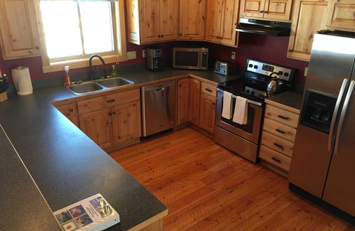La cocina de Lone Pine Lodge está bien equipada para manejar cualquier comida que su familia quiera disfrutar. Prepare un delicioso desayuno con una máquina de gofres belga. En esas noches frías, prepare una olla de chili o sopa con la olla de barro grande. Si tiene ganas de comer carne, prepare algunos filetes o hamburguesas en el nuevo 2015, todo en acero inoxidable, parrilla Charbroil de 3 quemadores.