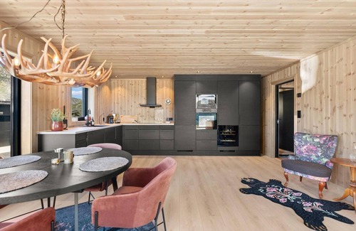 Le esperan unas vacaciones relajantes en esta moderna casa de vacaciones en Ljosland con maravillosas vistas a las montañas de los alrededores y al lago. Las luminosas habitaciones ofrecen un ambiente cálido y acogedor en el que se sentirá inmediatamente como en casa. El moderno mobiliario combina comodidad y estilo para que pueda pasar unos días relajantes con toda la familia rodeado de naturaleza, y la casa está situada en el lado soleado para que pueda disfrutar de las hermosas vistas desde el acogedor salón o la terraza.