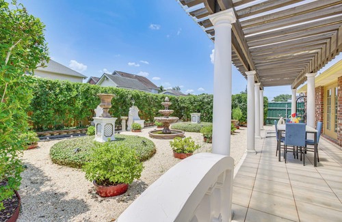 OUTDOOR LIVING: Fenced-in gardens w/ fountains, hammock, 2 outdoor dining tables, gas grill