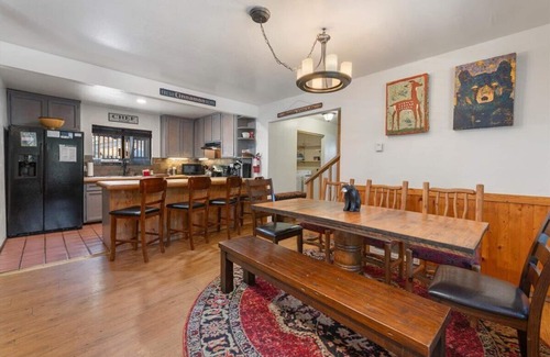 Esta casa tiene el espacio para una gran reunión familiar, o un grupo de amigos. Cuando entras por la puerta principal, te reciben con una enorme chimenea de roca, techos altos con marco A, mesa de billar, ventanas que dan al prado y un plano de planta abierto. La chimenea es de leña y el punto vocal de la habitación y todo lo que lo enfrenta. Los paneles de pino nudoso y los acentos de vidrio de color rodean la 'Gran Sala', dando al espacio una verdadera sensación de montaña. Dos sofás dan a la chimenea y al centro de entretenimiento con TV inteligente y reproductor de DVD. Un control deslizante se abre a la cubierta envolvente superior con muebles de jardín y barbacoa. Es genial sentarse aquí y respirar en los árboles. Desde aquí se ve el hermoso prado con altos pinos y el arroyo estacional. El olor de los pinos es fascinante. Debajo de la cubierta superior, hay una cubierta inferior para la bañera de hidromasaje. Debido a que la plataforma está nivelada al prado, se sabe que los inquilinos saltan de la bañera, hacen ángulos de nieve y luego vuelven a saltar. La casa también se encuentra en una suave pendiente para trineos y juegos de nieve para niños. Este es el lugar en cualquier terraza para relajarse y disfrutar de la vida silvestre y los sonidos del bosque.
