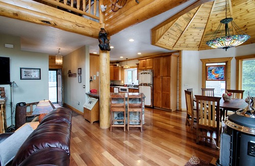 La gran sala de Denali tiene techos abovedados, carpintería a medida, estufa de pellets, chimenea de gas de estilo victoriano de piedra de río, pisos de cerezo brasileño y puertas francesas dobles de 8 pies que se abren a una vista del lago en la cubierta con animales y barandas tallados a mano personalizados. Use la parrilla de gas y disfrute de su cena en la cómoda mesa de la terraza, y encienda el fuego de gas para calentarse o asar malvaviscos. El televisor 3-D de pantalla plana, con selectas películas 3-D, está disponible si puedes alejarte del paisaje, así como las fotos y artesanías nativas de Alaska y América del Norte.