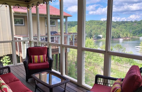 OUTDOOR LIVING: Furnished deck w/ lake views, screened-in sitting lounge, dining set, propane grill