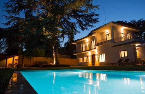 Tras la entrada principal se abre ante ti un jardín de 5.000 metros cuadrados que rodea y envuelve de paz la preciosa casa situada más adelante. Avanzas por el caminito de color cobre, a la izquierda ves una barbacoa de obra y al fondo a la derecha la piscina, esperándote. Justo en frente de ti se alza un imponente cedro centenario que te da la bienvenida.
