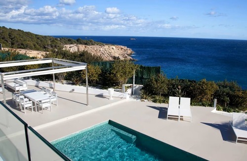 Built in a highly modern style, with many large window fronts and sleek, white decor, the vacation villa consists of 5 bedrooms (3 with king size beds and one with a queen size bed), 5 bathrooms (one whose bathtub offers a stunning sea view), one half-bath and a very well-equipped kitchen with a dishwasher, an induction stove, and Nespresso coffee machine, as well as a spacious and light-flooded living/dining room, which provides a panoramic view of both the pool area as well as of the sea. This highly private and luxurious property can therefore accommodate 8 people. Additional amenities include Wi-Fi, air conditioning in all rooms, satellite and cable television, a Sonos system (both indoors and outdoors), and an advanced alarm system. The property furthermore offers a baby cot, a children's bed, and a highchair as well as books and toys for children in order to ensure an utmost relaxing holiday for families. In the dreamlike outdoor area of the property, you will find everything the heart could desire. A large terrace, equipped with sun loungers, parasols, daybeds and multiple lounge areas, awaits you with its stunning panoramic view of the sea view and of the island Formentera in the distance. Here you can sunbathe beneath the Mediterranean sky and refresh yourself in the elegant pool or under the outdoor shower. The bedroom on the first floor of the property furthermore has access to its own private terrace and lounge, creating a multiplicity of areas where families and friends can unwind simultaneously. After a long day on the beach, you are invited to prepare delicious meals together on the barbecue and enjoy them at the long dining table under the pergola. Admire the romantic, raw nature of the surrounding landscape and sea as the sunset colors the sky. Although in a tranquil area, the property is fantastically situated to reach Ibiza town, Marina Botafoch and Talamanca beach: all of these are at most a 10-minute drive away. A private bay, however, with a rocky shore and turquoise waters, lies just 50 m away from your front door. This is true luxury on the beautiful island of Ibiza.