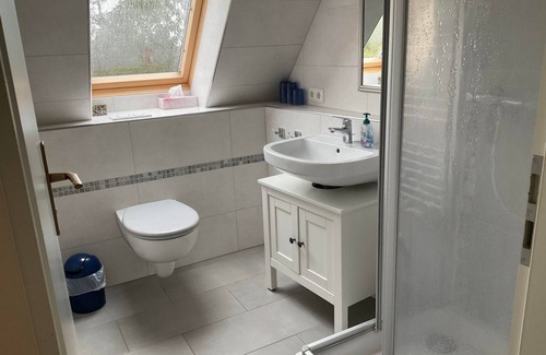 Apartamento Wadden Sea para hasta 5 personas arriba El apartamento tiene dos dormitorios, un dormitorio para 3 personas con una cama individual y literas, edredones de 140 x 200 cm (habitación infantil) está arriba, un dormitorio para 2 personas con cama doble, edredones en De gran tamaño, 155 x 220 cm (padres) se encuentra en el ático, baño con ducha e inodoro, la cocina está en la sala de estar y se completa con lavavajillas, vitrocerámica, horno, licuadora, tostadora, cafetera, tetera, cocina para huevos, nevera / congelador y microondas. equipada. Todas las camas son de 90 x 200 cm. TV, pequeño sistema de música. Por favor traiga toallas y paños de cocina.