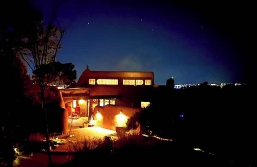 An elegant adobe cabin nestled in the Sangre de Cristo foothills, in a quiet 4 acres of pinon juniper forest. Immerse yourself in the BEAUTY of NATURE, sacred ARCHITECTURE, and original works of ART, w TREEHOUSE type views. Sparkling clean. 4 miles to the plaza, 3 miles to Canyon Road, 1 mile to museum hill