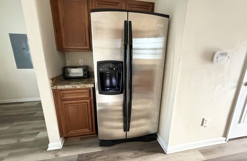 Reúnase alrededor de la mesa del comedor con capacidad para 4 personas para comer o jugar. La cocina cuenta con electrodomésticos negros sobre negros complementados con encimeras de granito liso y está equipada con todo lo que necesita para preparar comidas para familiares y amigos.