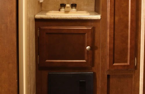 1. "Discover comfort in our stationary RV oasis with a snug bed for two."