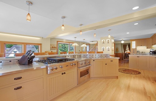 Al entrar, la entrada proporciona un lugar para sus abrigos, sombreros y sombrillas. En la habitación contigua, la gran cocina vikinga te saluda de inmediato. Hay hornos convencionales y de convección, dos estufas grandes, refrigerador, dos lavavajillas, microondas, tostadora e incluso un tanque de langosta en el mostrador. También notarás la cafetera estándar, Keurig, la licuadora y todos los accesorios y utensilios de cocina que puedas imaginar. El servicio de cena para 24 personas está en los armarios sobre los mostradores de acero inoxidable. El bar conectado tiene capacidad para 8 personas que quieran ver al chef familiar en acción. También hay una mesa de comedor con asientos adicionales para seis. La vista fenomenal del puerto hará de este un lugar favorito para cenar. Junto a la entrada a la cocina, observará el área del bar. Hay una nevera para vinos, fregadero, área de mostrador, tablas de cortar, cuchillos para pelar, cristalería y todo lo que necesita para beber con estilo (excepto el alcohol). No se preocupe en ese frente, ya que ambas tiendas generales locales son agencias estatales de licores, por lo que encontrará una maravillosa selección disponible. En el pasillo de conexión hay un medio baño, que es perfecto para retoques durante su reunión. Cuenta con un baño, lavabo y tocador.