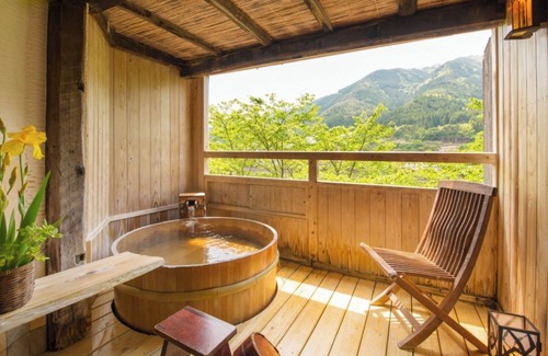 You can immerse yourself in the water up to your shoulders and enjoy a blissful moment From the openair bath you can hear the murmuring of the Hida River and the shade of t