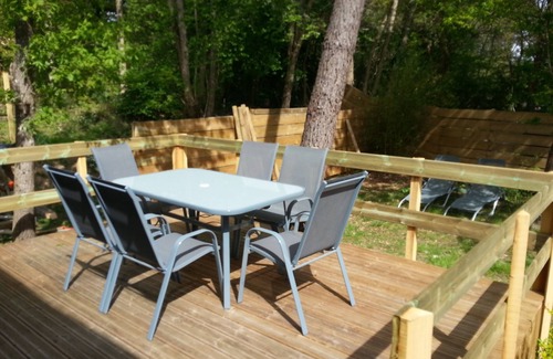 Una terraza soleada protegida de árboles, una plancha para la cocina de las Landas y una zona de relajación con hamaca y tumbonas.