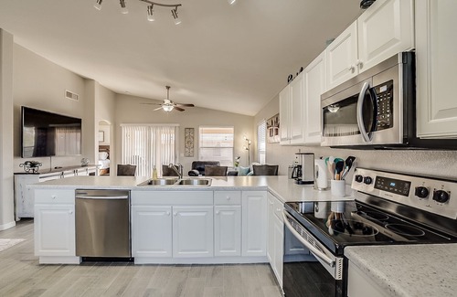 Esta MAGNÍFICA CASA RECIENTEMENTE remodelada y actualizada se encuentra en la deseable COMUNIDAD RESORTADA DE 55+ RESORT en CHANDLER, AZ. FOTOS ACTUALIZADAS PARA VENIR UNA VEZ QUE HAYAMOS AMUEBLADO LA CASA. ¡Esta será una casa completamente amueblada donde todo será nuevo! Muebles, electrodomésticos, TV de 75 ", centro de entretenimiento, vajilla, toallas, ropa de cama, parrilla, muebles de exterior, etc. TODO NUEVO! Si te gusta vivir en un resort, este es el lugar para estar. Limpio, moderno hogar de 2 dormitorios / 2 baños con campo de golf a poca distancia. Tendrá acceso a todas las comodidades de la comunidad. GOLF, CLUBHOUSE, FITNESS CENTER, 2 PISCINAS AL AIRE LIBRE, PISTA DE TENIS, PISTAS DE PICKLE BALL, PISTA DE BALONCESTO, HERRADURAS, BOCCE BALL, SHUFFLEBOARD ¡Y MUCHO MÁS! El campo de golf es un campo de 18 hoyos con una belleza increíble y a solo unos minutos de la puerta principal. Hay senderos para caminar en toda la comunidad con una vista espectacular de las estribaciones. Chandler es una ciudad maravillosa que está cerca de tantas áreas adyacentes ... MESA, GILBERT, SCOTTSDALE Y PHOENIX, por nombrar algunas. Chandler tiene mucho que ofrecer ... excelentes tiendas, restaurantes, casinos, campos de golf, senderismo, mercadillos, museos. Todas las áreas están dentro de un corto trayecto en coche con mucho para experimentar. Chandler tiene algunas fabulosas áreas de compras, incluido el CHANDLER FASHION CENTRE MALL, que tiene cientos de tiendas y restaurantes de marca dentro del edificio. Otras atracciones de los alrededores incluyen BALONCESTO DE ENTRENAMIENTO DE PRIMAVERA, MERCADO DE PULGAS DE MESA, SUBASTA DE AUTOMÓVILES BARRET JACKSON, OLD TOWN SCOTTSDALE, PESCA URBANA, TEMPE TOWN LAKE. La lista sigue y sigue ... ¡mucho que hacer en esta hermosa zona! ¡Ven a disfrutar de nuestra casa para experimentar esta vida estilo centro turístico! Te encantará lo relajante y hermoso que es ... ¡como deberían ser las vacaciones!