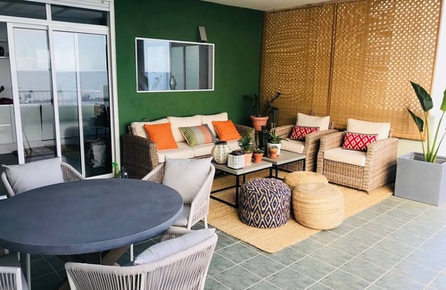 Gran terraza de 37 m2 y una pequeña terraza de 7 m2 equipada con una cómoda sala de estar y comedor.