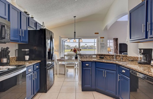 La mayoría de las habitaciones principales dan a la hermosa piscina y al lago. La gran sala tiene un techo de catedral que le da un ambiente amplio, luminoso y espacioso. Tiene tres sofás de cuero de 3 plazas suntuosos y suaves. Para su disfrute, ofrecemos un sistema de entretenimiento en el hogar, que incluye canales de TV LCD de alta definición de 52 pulgadas con sistema de cine en casa con reproductor de DVD con soporte para iPod. Las puertas correderas conducen desde la cocina abierta y el área de desayuno a la terraza de la piscina. Se instalaron encimeras de cocina de granito, tiene una amplia gama de hornos, lavaplatos y microondas. Encontrará una gran mesa con capacidad para seis y dos taburetes en la encimera, podrá mirar hacia la piscina. cubierta, lo que le permite disfrutar de las escenas frente al lago mientras come. Hay un comedor formal adicional para seis personas convenientemente situado cerca de la cocina. Con su exquisita mesa de cristal y sus ornamentados herrajes, es realmente un área elegante para entretener.