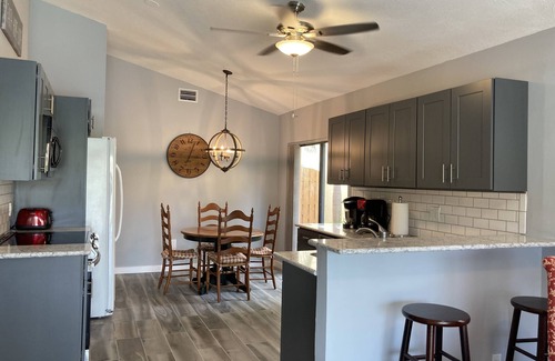 Florida Home en comunidad cerrada. Coma en la cocina, lavadora y secadora, comedor y sala de estar abierta y aireada con vistas a la piscina y estanque del patio trasero. El dormitorio principal tiene una nueva cama King size, un colchón y un dormitorio con vistas y acceso a la piscina del patio trasero. El baño principal tiene una bañera grande, una cabina de ducha separada, dos tocadores con lavabo y vestidor. El segundo dormitorio tiene colchones y muebles de dormitorio nuevos tamaño Queen. Segundo baño tiene ducha. La sala de televisión tiene TV de pantalla de 48 pulgadas, escritorio y sofá que se abre a la cama de tamaño completo. Una piscina relajante con excelentes vistas del estanque. The Club House tiene una gran piscina climatizada, canchas de tenis, balonmano, canchas de baloncesto y área de juegos. Además, hay una sala de ejercicios que tiene pesas libres y máquinas de cardio. Nuestra casa viene con dos bicicletas, 3 sillas de playa, paraguas. 3 toallas de playa grandes Las sábanas y las sábanas están completamente amuebladas.