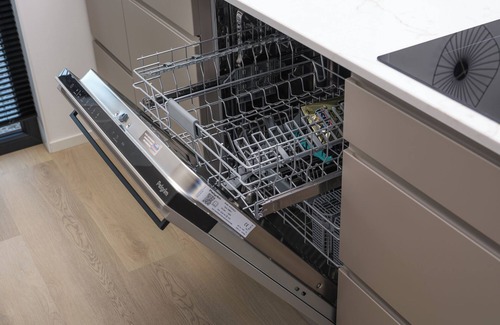 There are two bedrooms with comfortable box-spring beds, each with an ensuite bathroom featuring a walk-in rain shower. A separate toilet adds extra convenience.
