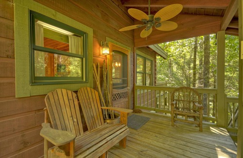 Thunder Falls tiene hermosas camas de troncos hechas a mano, una reina en el dormitorio del nivel principal con dos asientos en la ventana, un espejo de cristal manchado y baño contiguo. La cama Queen en el dormitorio principal de nivel loft tiene una terraza acristalada privada, un pequeño televisor de pantalla plana y un reproductor de DVD. El área del loft tiene un amplio escritorio incorporado y espacio de trabajo, aunque con acceso inalámbrico en toda la cabina no necesita sentirse contenido. Los huéspedes pueden acceder a la bañera de hidromasaje humeante de la cabina y a otros asientos al aire libre a través del sótano inacabado de la cabina, y desde esa cubierta inferior siguen más escaleras ajardinadas hasta la pequeña cubierta de la ladera escondida en los laureles y las ciclancas circundantes, con vistas a las cataratas que corren por debajo.