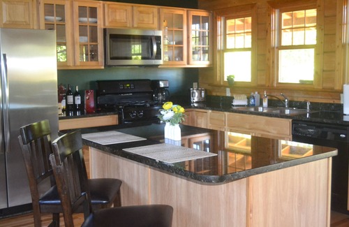 4 dormitorios, 3 baños: ideal para una reunión familiar grande o un retiro íntimo con techo abovedado altísimo e interior de madera rústica y una gran chimenea de leña.