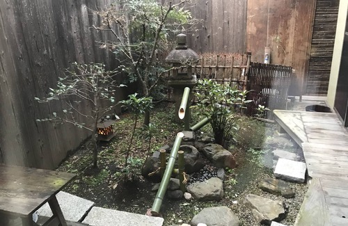 Hay un jardín en miniatura de Kioto entre las dos grandes alfombrillas de tatami y puedes disfrutar del ambiente de una casa adosada.