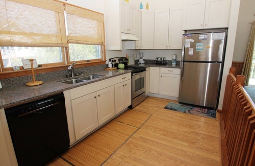 Nivel superior: Gran sala con TV de pantalla plana / Blu-Ray DVD / VCR, chimenea de leña y acceso a la terraza, baño completo, cocina con barra de 5 asientos y el comedor con 2 mesas con un total de 13 y acceso a la cubierta.
