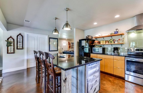 Desde la cocina de concepto abierto, se asoma a la cala que rodea una isla salpicada de árboles. Todos los tipos de vida silvestre se pueden ver en la cala, desde la nutria hasta los castores, desde los peces hasta las tortugas y desde las aves de grulla hasta los halcones y los búhos. Nuestra cala es una cala no-vigilia. Perfecto para kayak, pesca y flotando! ¡Puedes amarrar tu bote / moto acuática en el mamparo y relajarte! La moderna cocina cuenta con mostradores de granito negro con una gran isla central para el entretenimiento. Hay estantes superiores abiertos, completamente equipados con platos de cocina. Fuera del patio trasero hay un fumador / parrilla y muebles de hierro forjado al aire libre. ¡No olvide su líquido de carbón / encendedor!