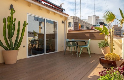 Lo más destacable de este increíble apartamento es su terraza de 20 m² con vistas a la ciudad de Valencia, equipado con una gran mesa de jardín y un sofá; a la que se puede acceder desde el amplio salón comedor y la cocina americana. Posee dos dormitorios y tiene capacidad para tres personas, además de dos baños. Es muy luminoso, tranquilo, moderno y está completamente equipado. El edificio en el que se encuentra dispone de ascensor.