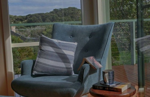 La zona de estar tiene vistas panorámicas a las dunas de la playa de Koonya, un calentador de leña, TV con pantalla curva UHD con Netflix, sistema de sonido multihabitación con Bluetooth y una biblioteca con una silla de lectura. WiFi NBN está incluido (¡y funciona bien! )