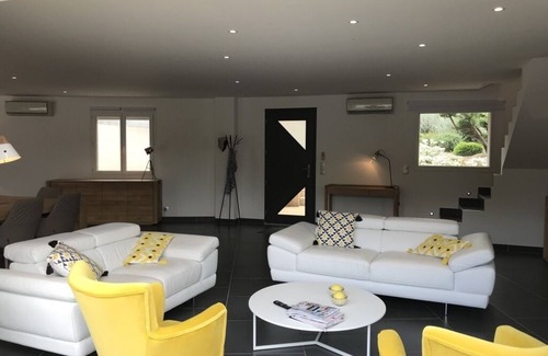 Grande villa récente de 200m² spacieuse située à moins de 6km de Porto-Vecchio, dans un hameau et maquis, avec grande piscine chauffée, idéale pour les enfants, et grande terrasse.